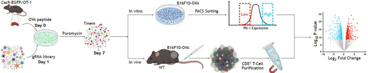 近年来肿瘤的免疫治疗发展迅速,是目前治疗肿瘤最有效的策略之一。然而,这些免疫疗法只在某些肿瘤类型和某些患者中表现出显著疗效,其中的机制目前尚不清楚。本实验室通过将体外和体内的全基因组及定制的CRISPR/Cas9筛选相结合,并结合临床患者样本,旨在系统地鉴定出可调控肿瘤免疫治疗效果的新基因和相关通路。