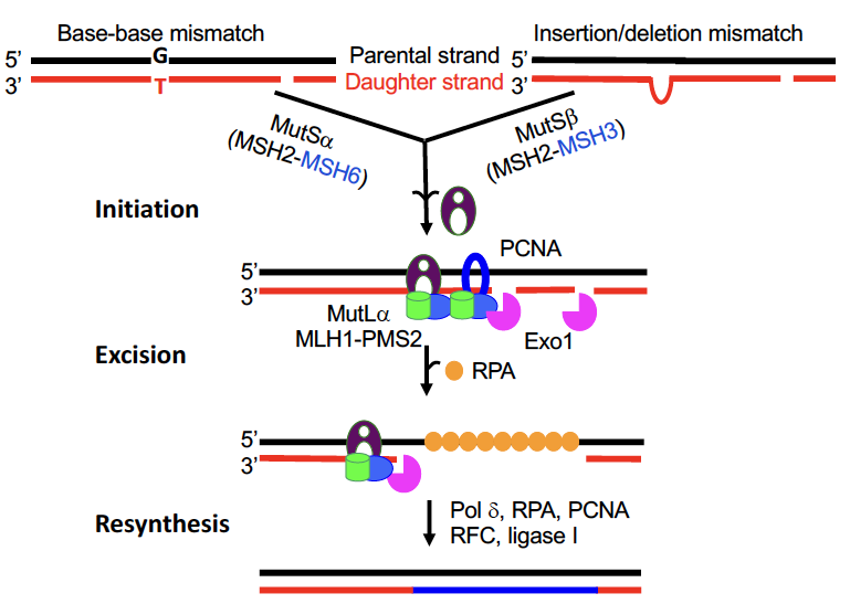 DNA错配修复(MMR)通过纠正新合成链中的复制错误来维持基因组稳定。我们离体重塑MMR的研究表明,MutS和MutL家族蛋白识别错配,起动错配修复反应,二者招募核酸酶 Exo1来切除错配碱基。所产生的缺口由DNA聚合酶填补,从而完成醋配修复反应(见下图)。尽管进行了大量研究,MMR中许多基本问题仍未解决。比如: