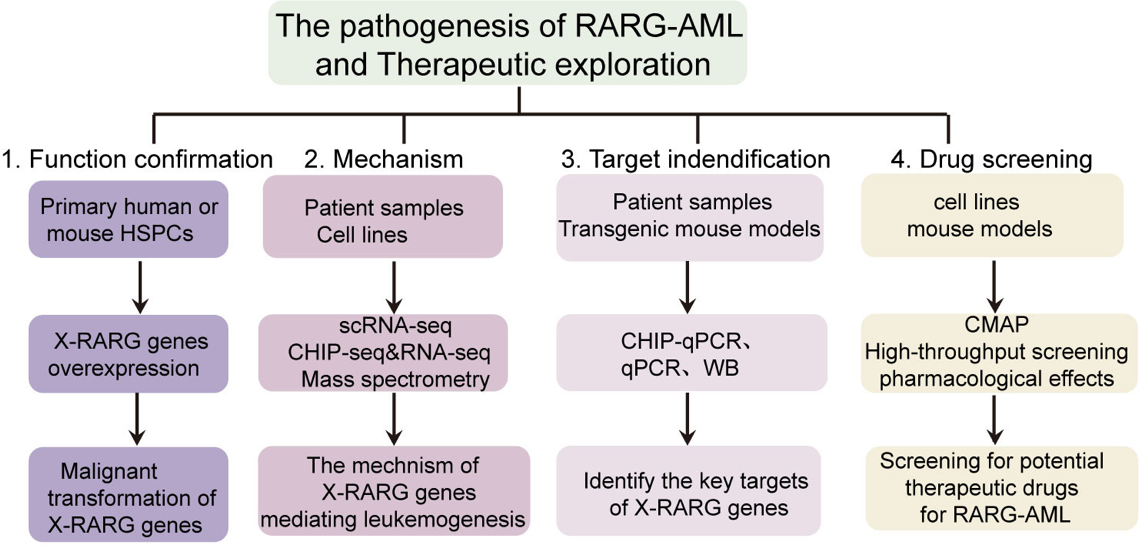 团队领导了全球38个中心合作小组的组织,系统地分析了临床、MICM和转录组数据,首次提出将RARG-AML定义为一种新的白血病类型。并通过构建含有RARG-融合基因的细胞系、CDX/PDX小鼠模型、单细胞测序、CHIP-Seq和RNA-Seq技术,分析致病蛋白和DNA与其他蛋白的相互作用,阐明其发病的分子机制;通过c-MAP和高通量药物筛选平台寻找有效的治疗药物;为RARG-AML的诊断、风险评估和治疗策略建立新的标准。