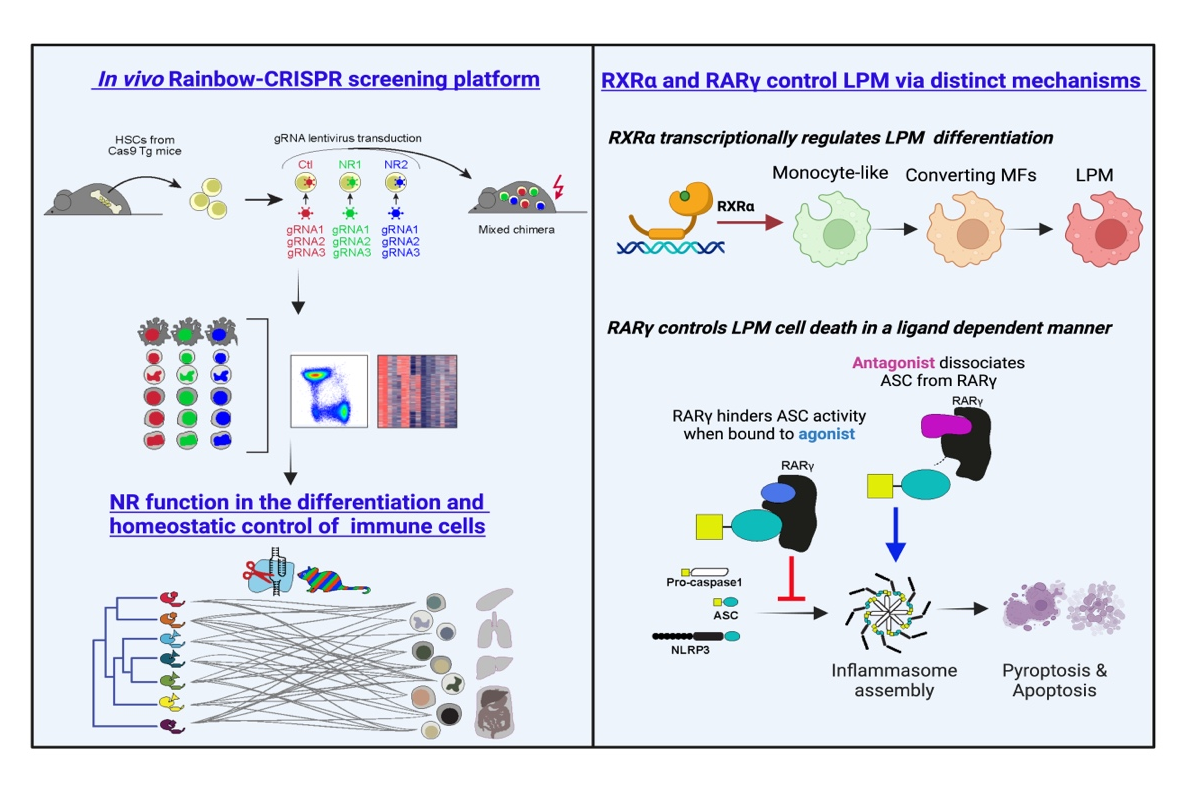 1. 建立高通量体内“Rainbow-CRISPR”筛选系统,系统解析核受体家族成员在免疫细胞分化和稳态维持中的作用,揭示视黄酸受体通过转录调控和炎症小体活化双重机制调控GATA6⁺腹腔巨噬细胞命运 (Immunity, 2024, 一作)