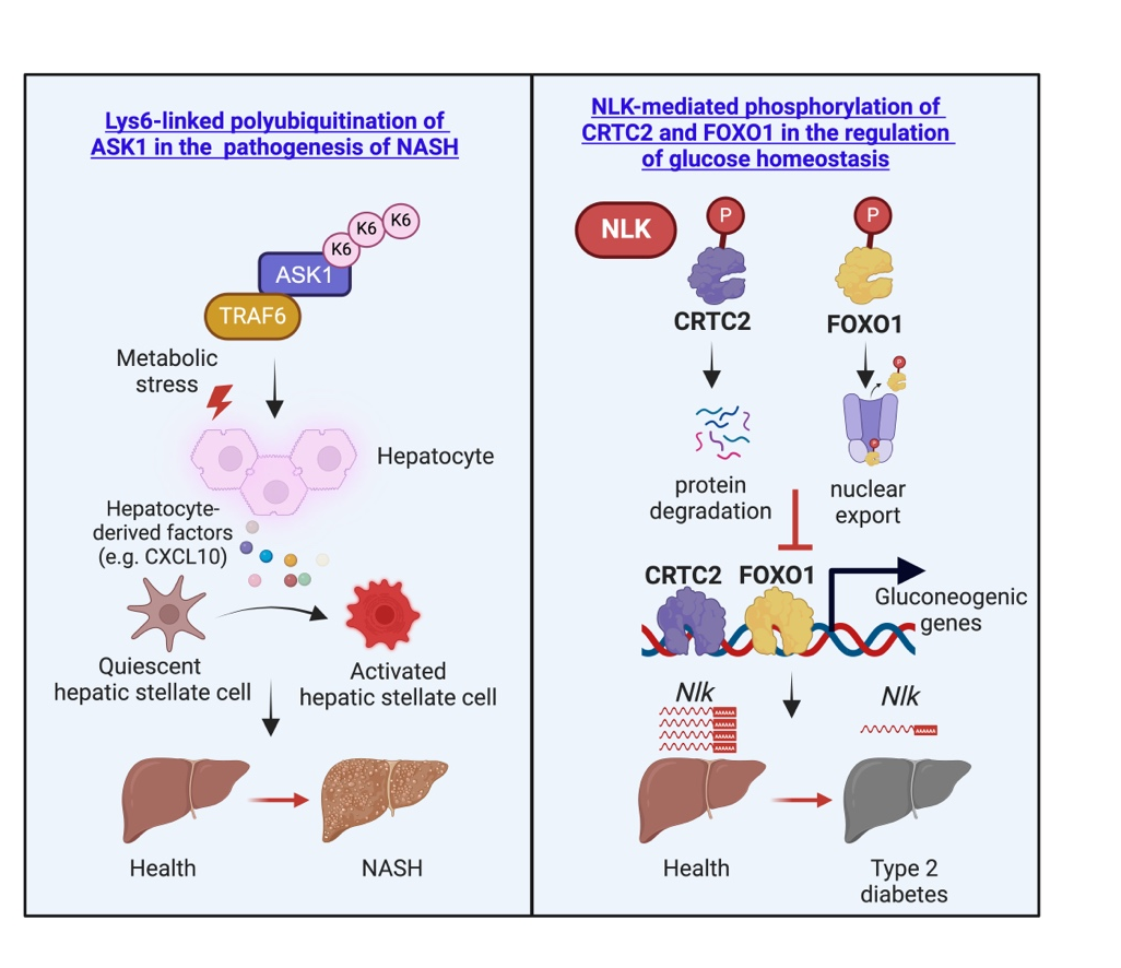 2. 揭示TRAF6介导的ASK1 Lys6-连接的多聚泛素化修饰是肝脏炎症和纤维化的关键驱动因素 (Hepatology, 2019, 一作);发现NLK激酶是抑制肝糖异生的关键分子,揭示血糖稳态调控的新机制 (Cell Metabolism, 2021, 并列一作)