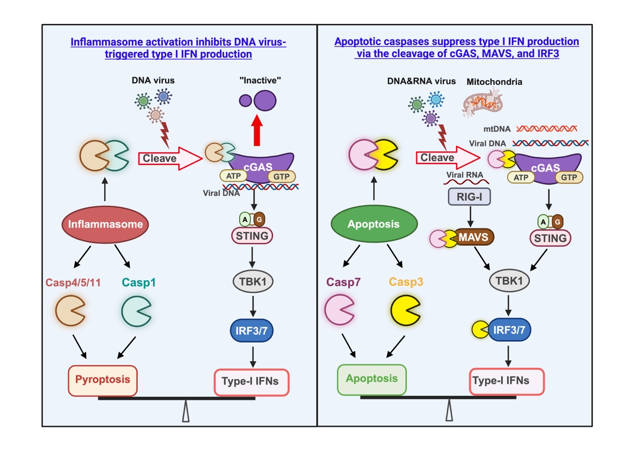 3. 阐明Caspase家族成员在抗病毒天然免疫稳态和维持细胞凋亡免疫沉默中的调控作用(Immunity, 2017, 一作; Molecular Cell, 2019, 并列一作)