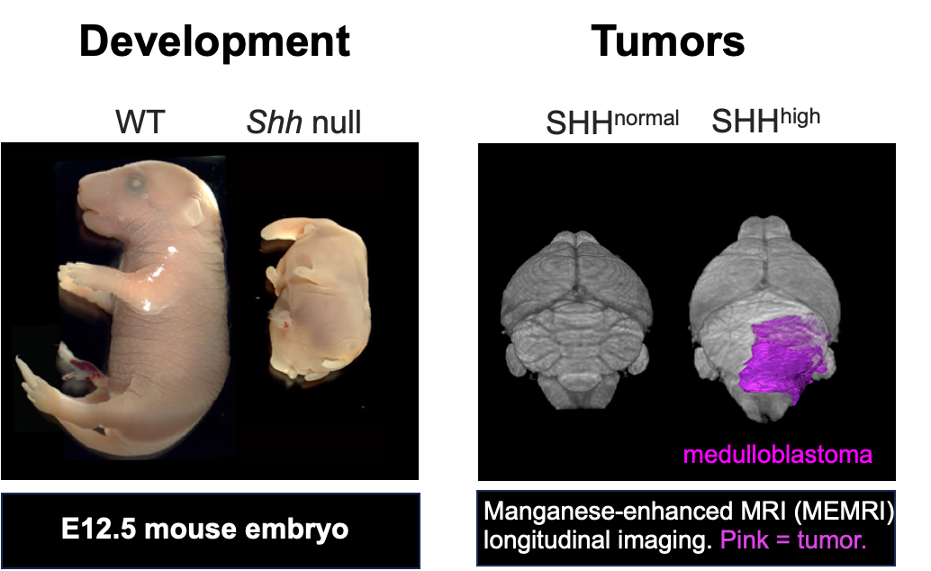 HH通路在胚胎发育和器官稳态中发挥重要作用,过度激活通路引起肿瘤。左图,野生型和Shh突变小鼠胚胎;右图,SHH髓母细胞瘤。