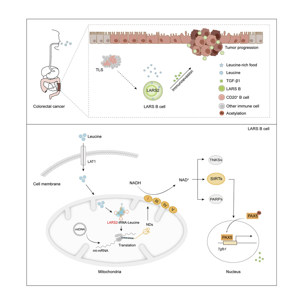 亮氨酸(Leu)是一种必需氨基酸,是维持肌肉细胞功能的重要能量来源,通常作为恶性肿瘤患者的营养补充剂。该研究发现在CRC中富集的Breg细胞高度表达线粒体亮氨酸-tRNA合成酶-2(LARS2),显示出对亮氨酸的营养偏好。LARS2表达的B细胞(LARS B)具有TGF-β1显性调控表型,并由于LARS2的高表达而显示出增强的线粒体蛋白生物合成。亮氨酸通过促进还原的NAD+(NADH)脱氢酶的LARS2依赖性翻译来促进线粒体烟酰胺腺嘌呤二核苷酸(NAD+)再生,从而编程氧化代谢并促进TGF-β1的产生。LARS B细胞缺失抑制TGF-β1介导的免疫抑制和CRC生长。在CRC患者中,LARS B细胞位于TLS外,与肿瘤生长加速有关。肿瘤床中LARS B细胞的频率与肿瘤增生和患者生存期缩短呈正相关。在最后,对于CRC治疗,研究人员提出了一种亮氨酸节食方案来阻断B细胞介导的免疫抑制。