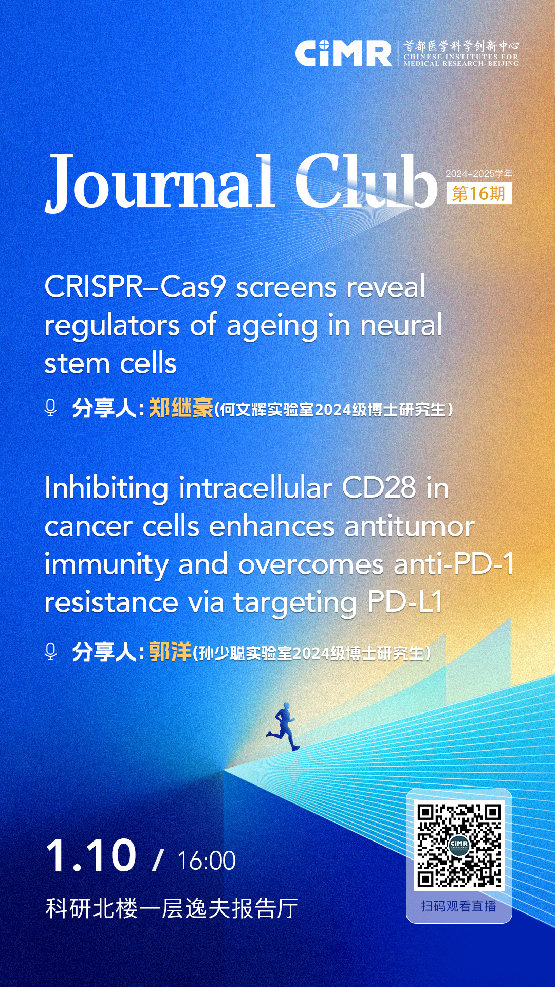 2024级博士研究生 郑继豪(何文辉实验室),将探讨的文章是“CRISPR–Cas9 screens reveal regulators of ageing in neural stem cells. Ruetz TJ, Pogson AN, Kashiwagi CM, Gagnon SD, Morton B, Sun ED, Na J, Yeo RW, Leeman DS, Morgens DW, Tsui CK, Li A, Bassik MC, Brunet A. Nature. 2024 Oct;634(8036):1150-1159. doi: 10.1038/s41586-024-07972-2.”