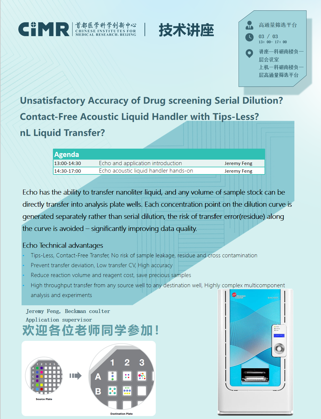 高通量筛选平台Echo650声波移液系统已安装调试完毕。为更好了解该系统,将于2025年3月3日举办“Echo移液系统原理及应用”,具体安排如下:
