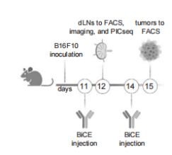 为了评估BiCE在体内靶向形成T-DC突触的能力,作者在多个时间点分析了BiCE注射小鼠的B16F10黑色素瘤肿瘤和肿瘤dLN组织。