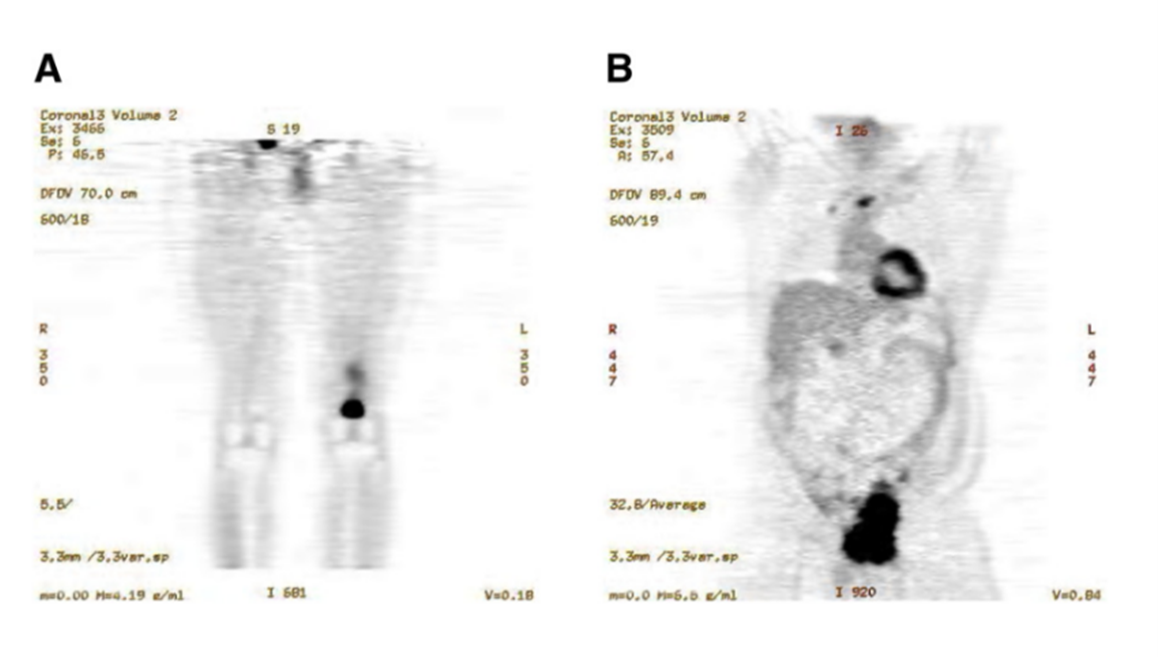 图2 原发性肉瘤肿瘤患者的18F-FDG PET 图像。 (A) 左侧股骨骨平滑肌瘤患者的冠状面图像。 (B) 右侧骨盆血管肉瘤患者的冠状面图像。