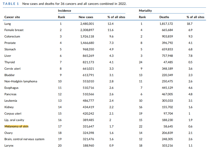- 排名:从新增病例数看,非黑色素瘤皮肤癌(Non-melanoma skin cancer,NMSC)是全球第4大常见癌症,黑色素瘤(Melanoma skin cancer,MSC)位列第17,见图1。