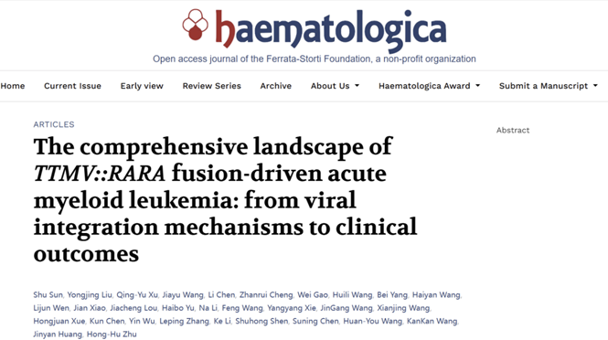 近日,首都医学科学创新中心高级研究员、北京朝阳医院血液科主任主鸿鹄教授团队在《Haematologica》上发表题为 “The comprehensive landscape of TTMV::RARA fusion-driven acute myeloid leukemia: from viral integration mechanisms to clinical outcomes” 的研究论文。该研究系统揭示TTMV通过微同源介导末端连接机制特异性整合至人类基因组。此类患者以儿童为主,常伴有髓外病变及i(17)(q10)异常核型,并对全反式维甲酸(ATRA)联合砷剂(ATO)治疗具有较高敏感性,但仍面临高复发风险,提示造血干细胞移植可能作为潜在根治策略。该研究首次全面绘制了TTMV::RARA融合基因阳性白血病的临床-分子全景图谱,为该类罕见血液肿瘤的精准诊疗体系构建提供了关键依据。