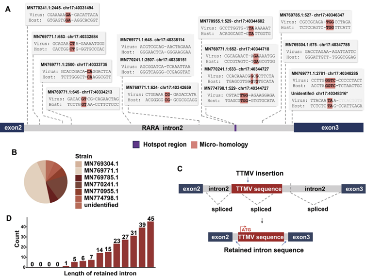研究共鉴定出7种参与整合的TTMV病毒亚型,其中MN-769771.1为主要病毒株。所有病毒插入均精准定位于RARA基因的2号内含子区域,整合位点存在2–4 bp的微同源序列,提示该融合基因形成依赖于“微同源介导的末端连接”机制。进一步研究发现,病毒插入后首先形成RARA::TTMV::RARA前体转录本,随后通过可变剪接生成保留RARA完整开放阅读框的成熟致癌融合基因。