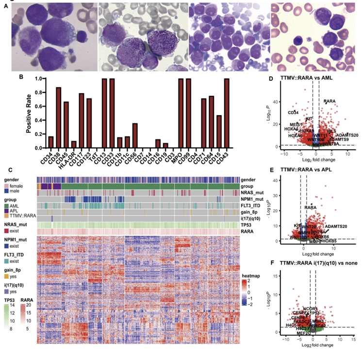 进一步MICM特征分析显示,尽管TTMV::RARA-AML患者具备APL的形态学和免疫表型特征,但其遗传学及转录组表达谱与经典APL存在明显差异,并常伴随i(17)(q10)染色体异常。基于该异常可将患者进一步划分为两个分子亚群,为预后分层提供了依据。