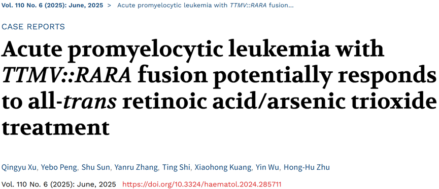 Xu Q, Peng Y, Sun S, et al. Acute promyelocytic leukemia with TTMV::RARA fusion potentially responds to all-trans retinoic acid/arsenic trioxide treatment. Haematologica (2025) 1;110(6):1426-1431.