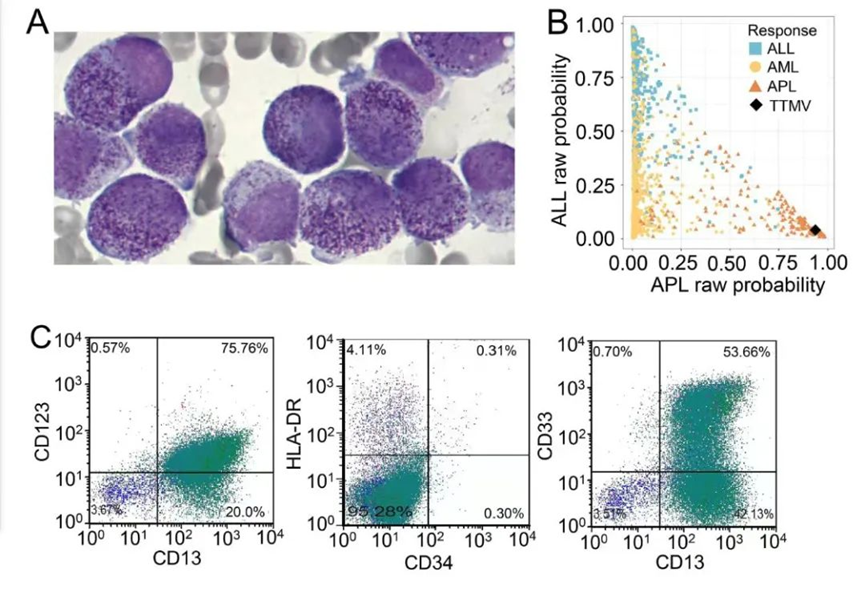 尽管由病毒-人源融合基因驱动,该患者体内的白血病细胞在形态上(表现为粗颗粒型早幼粒细胞)和免疫表型上与经典APL相似。然而,研究提示,TTMV::RARA相关APL可能更易出现中枢神经系统浸润,并具有独特的基因突变背景,这预示着其临床行为可能存在差异。
