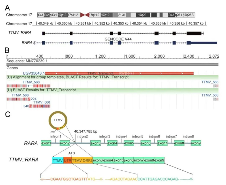 通过对患者骨髓样本的深度测序分析,研究团队精确描绘了TTMV::RARA融合基因的“结构蓝图”:病毒序列整合在RARA基因的第3外显子上,形成了一个长达2354个碱基的融合转录本。研究人员在其中识别出病毒ORF2核心序列及其保守结构域,为后续探索其致癌机制提供了关键线索。
