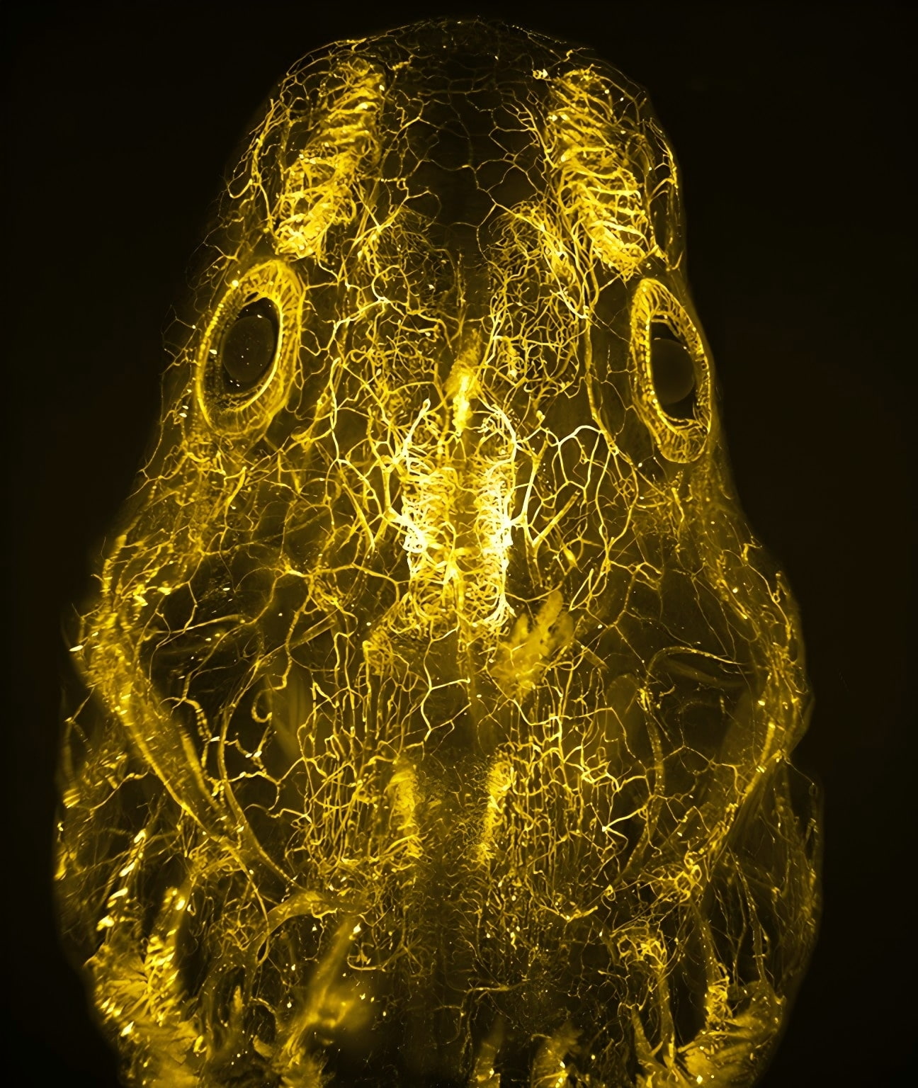 光片图像显示经过血管标记的蝾螈头部完全清理胸腺后的情况(使用荧光凝集素进行标记)