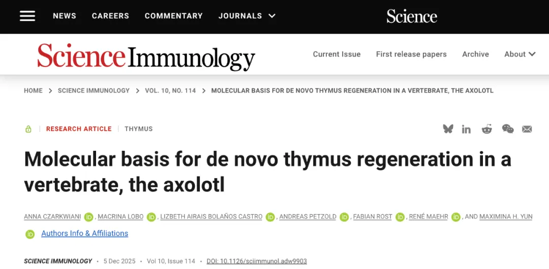 2025年12月5日,首都医学科学创新中心高级研究员Maximina Hee Yun与团队携手麻省大学医学院René Maehr教授团队,在《科学免疫学》(Science Immunology)发表了一项里程碑式的研究,首次证实有一种脊椎动物,能够在无任何胸腺组织残留的条件下,再生一个完整的胸腺。
