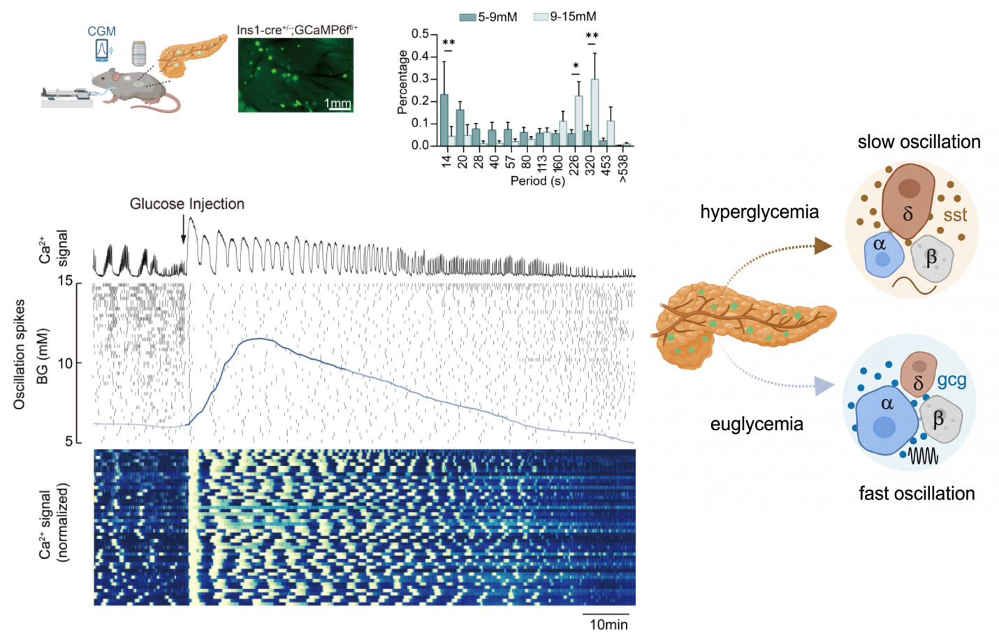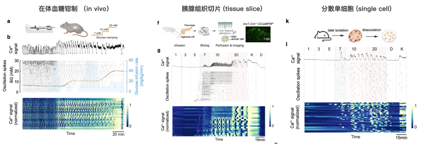 图1. 为探索血糖如何调节胰岛群体活动,研究团队在活体小鼠中实现了20–100个胰岛的同步钙成像观测,发现胰岛钙振荡节律会随血糖水平发生精准的协同性慢-快转变:当血糖从高血糖状态回落至正常血糖水平时,胰岛钙振荡周期会从226–320秒的慢周期,同步切换为14–20秒的快周期,这一转变是健康胰岛适应血糖变化、维持血糖稳态的重要特征。
