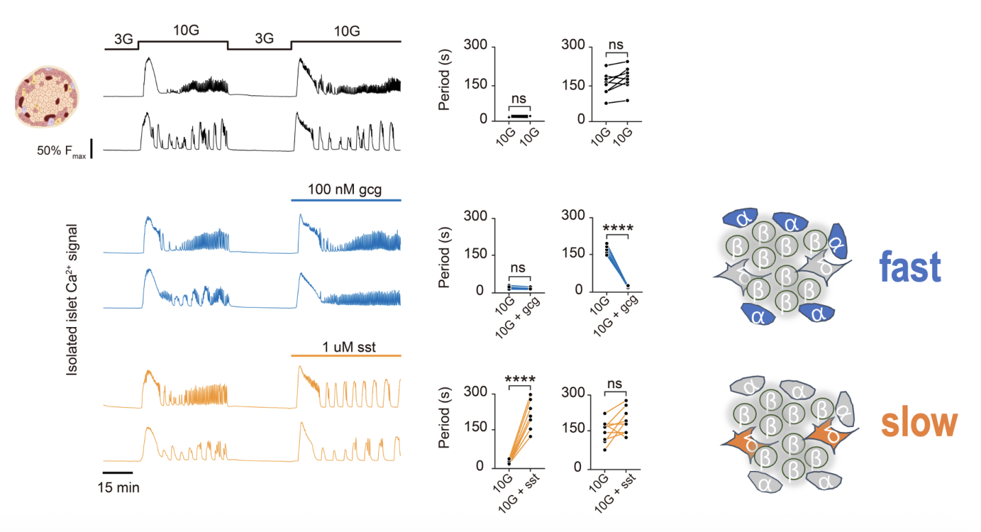 为探究胰岛节律的旁分泌调控机制,研究团队在体外分离胰岛中进行了高糖刺激实验(图3)。结果显示,在高糖环境下,胰岛呈现出两种内在的、可重复的钙振荡模式——快振荡与慢振荡,据此可将胰岛分为两类。进一步实验发现,添加外源性胰高血糖素(由α细胞分泌)后,无论原本是快振荡还是慢振荡的胰岛,均转变为快速振荡模式;而添加生长抑素(由δ细胞分泌)后,两类胰岛则均转变为慢速振荡模式。这一结果表明,δ细胞与α细胞的相互作用在胰岛节律调控中发挥着关键作用:α细胞的激活主导快振荡的发生,δ细胞的激活则主导慢振荡的维持。