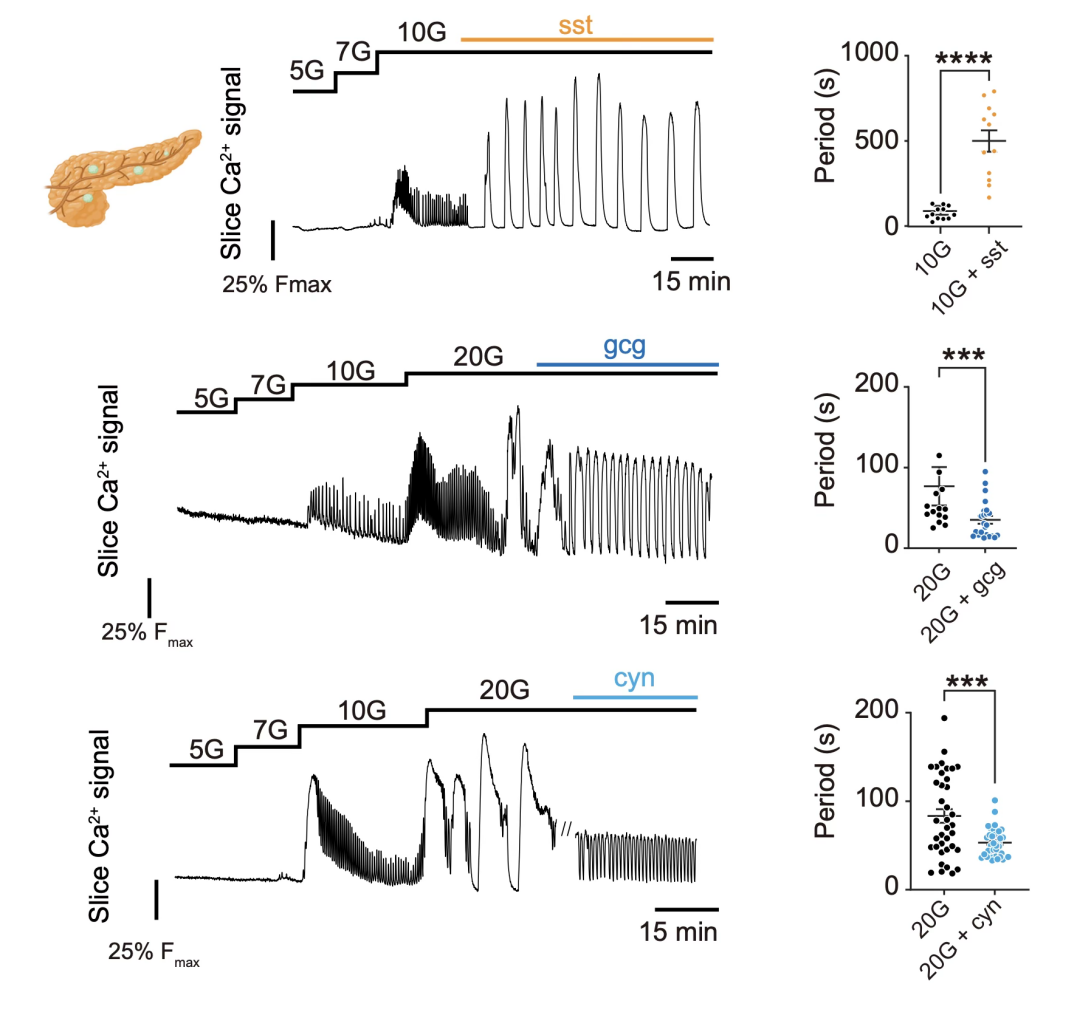 那么,血糖水平是如何通过δ细胞与α细胞的相互作用实现节律编码的呢?以往研究已明确,α细胞对低血糖强响应,而δ细胞对高血糖强响应。基于此,研究团队提出如下调控模型:在高血糖状态下,δ细胞被激活并分泌生长抑素,进而抑制α细胞活性,使胰岛呈现慢钙振荡节律;当血糖恢复至正常水平时,δ细胞的抑制作用解除,α细胞被激活并分泌胰高血糖素,进而触发胰岛的快钙振荡节律。为进一步验证这一猜想,团队开展了受体阻断实验。结果显示,阻断δ细胞对α细胞的抑制,或激活相关信号通路,均可有效调控胰岛的钙振荡周期(图4)。这一系列实验证实,δ–α细胞相互作用是血糖状态编码胰岛节律的核心机制:α细胞的激活主导快振荡,δ细胞的激活主导慢振荡,二者通过旁分泌信号实现血糖水平的动态响应与节律转换。