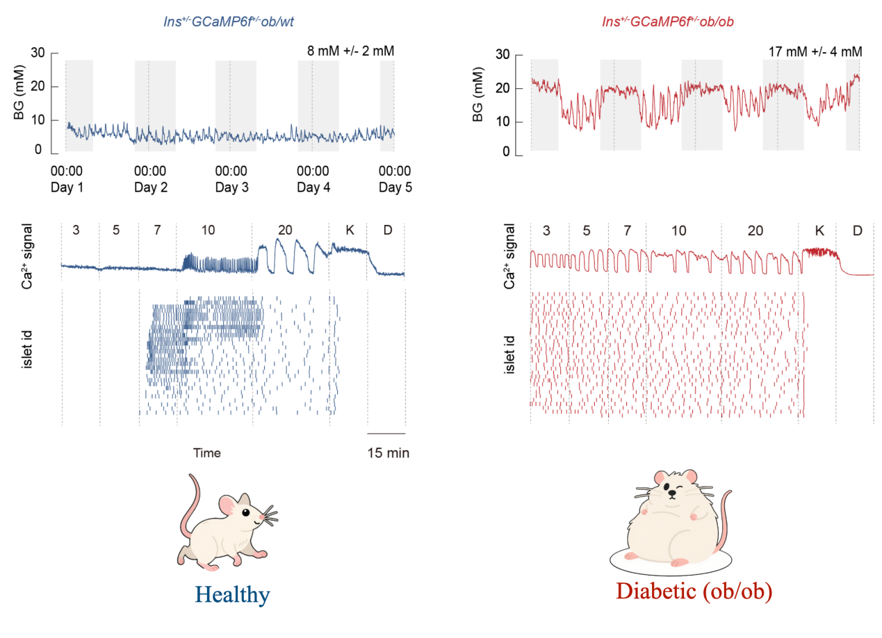近年研究已证实,胰岛的节律性振荡对血糖控制至关重要。然而,一个核心问题长期未解:人体胰腺中分布着上百万个胰岛(小鼠约数千个),它们如何像一支交响乐团般协同“演奏”,共同维持血糖稳定?目前的研究局限于单个胰岛或离体组织,缺乏在活体水平同步观测数十甚至上百个胰岛动态行为的技术手段。因此,在血糖从高到正常、从稳定到波动的变化过程中,成百上千个胰岛如何协同“换挡”,感知并编码血糖状态,仍有待揭示。