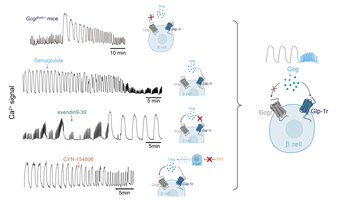 机制上,研究发现胰岛快钙振荡的产生依赖于GLP-1受体(Glp1r)的内源性激活(图6),GLP-1受体激动剂司美格鲁肽可有效激活该通路,不仅能快速降低糖尿病小鼠的血糖水平,还能恢复其胰岛的HESF节律转变功能,使胰岛钙振荡模式恢复至接近正常小鼠的状态。